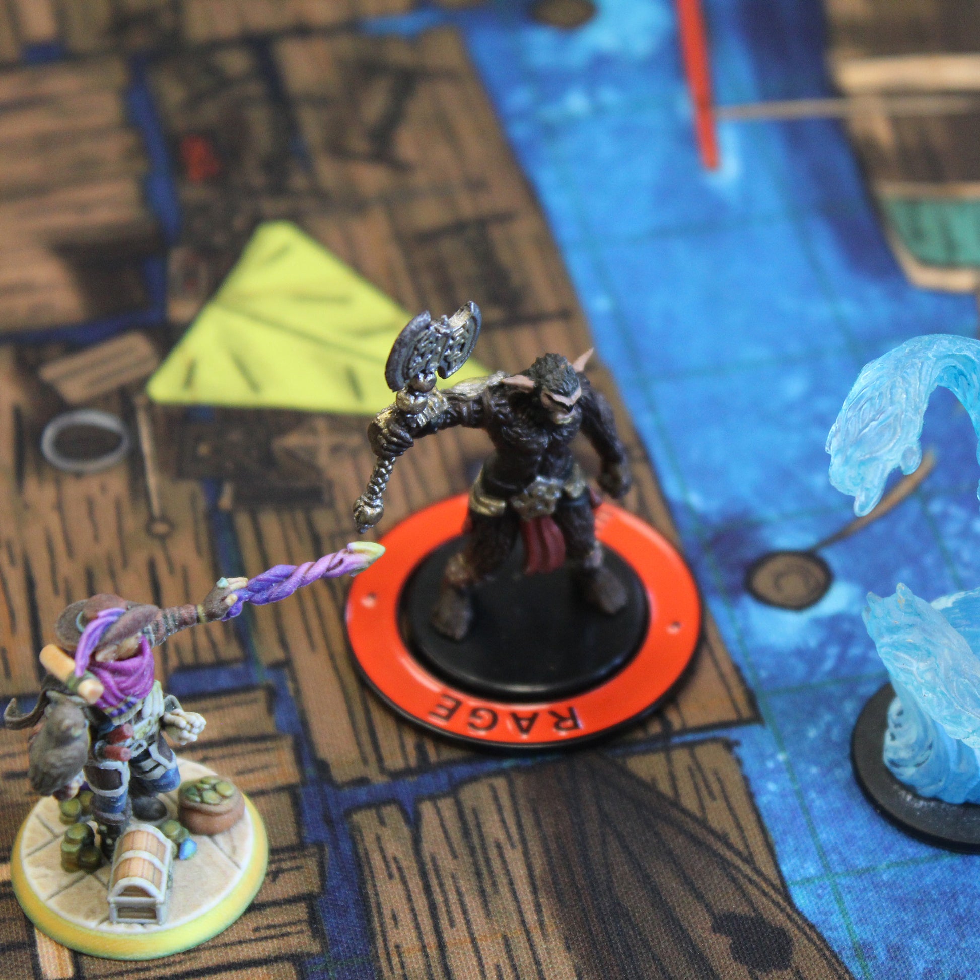 We've created condition trackers in the form of ringed coins that you can use to mark what conditions are affecting your characters or monsters. Place the miniatures inside the precisely machined inset (made to fit standard 1" circular miniature bases), or hang the rings on your larger miniatures to mark them. Solid metal with enamel inset.