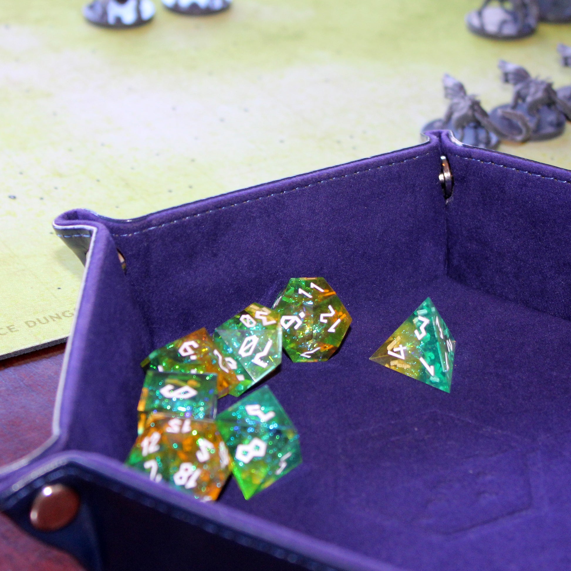This sharp edge resin dice set makes a beautiful addition to any RPG game. Beneath the blue-green colored resin shines beautiful iridescent inclusions that catch even the softest light. Different angles bring out gleams of gold and peach in the center of the dice. This set is perfect for rangers and druids that roam verdant forests, as well as shifting and mischievous faerie characters. Each part of the 7 piece set features a unique Roman-inspired font, inked in silver.